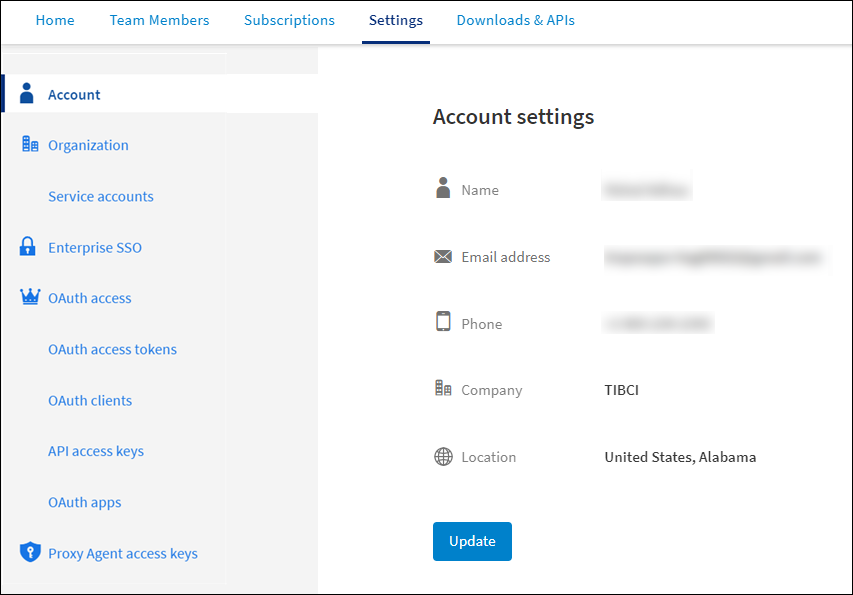 Signed in users can edit their account information on the Settings tab in TIBCO Cloud.