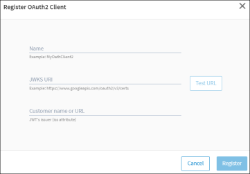 In the Register OAuth2 Client window, fill in the information, and then click Test. After you see a message informing you that the test has been successful, click Register.
