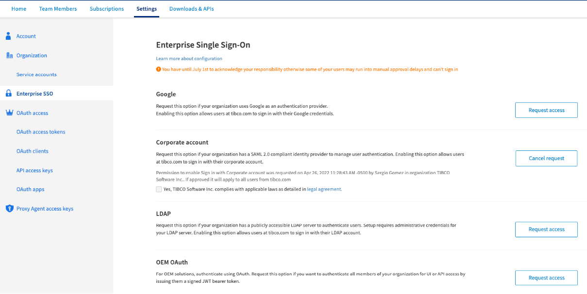 To enable Google as the IdP for your email domain, you must first send an authorization request to TIBCO to enable Google as the IdP for your email domain because the decision applies to all users of your email domain. After your authorization request is approved, you are notified via email. You can then enable Sign in with Google. The changes are implemented immediately.