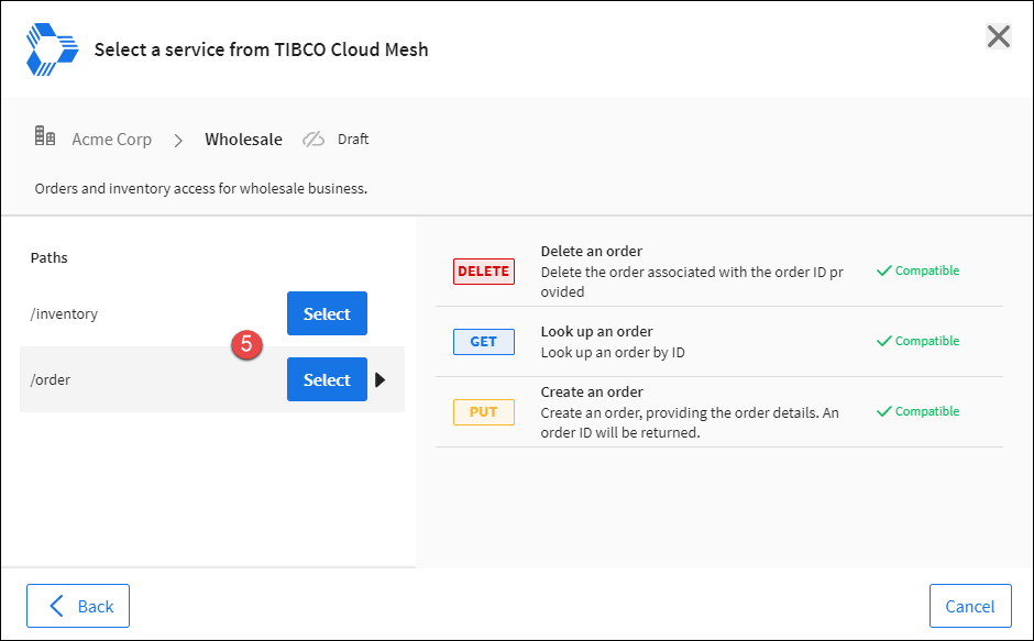 For some TIBCO Cloud domain capabilities participating as consumers of TIBCO Cloud Mesh: Services, the experience launches a TIBCO Cloud Mesh: Services modal dialog for selecting services. Currently, in the TIBCO Cloud Mesh: Services dialog you can select a single service and an endpoint path within that service.