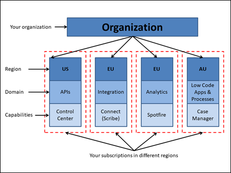 When you purchase a domain capability in a region, it is termed as a subscription. For example, you might want to purchase Spotfire capability in the Analytics domain for the EU region.