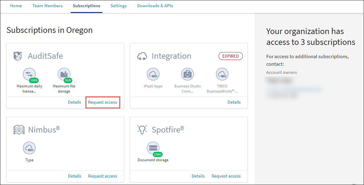 Sign in to TIBCO Cloud and then either go to the Team Members tab or to the Subscriptions tab.